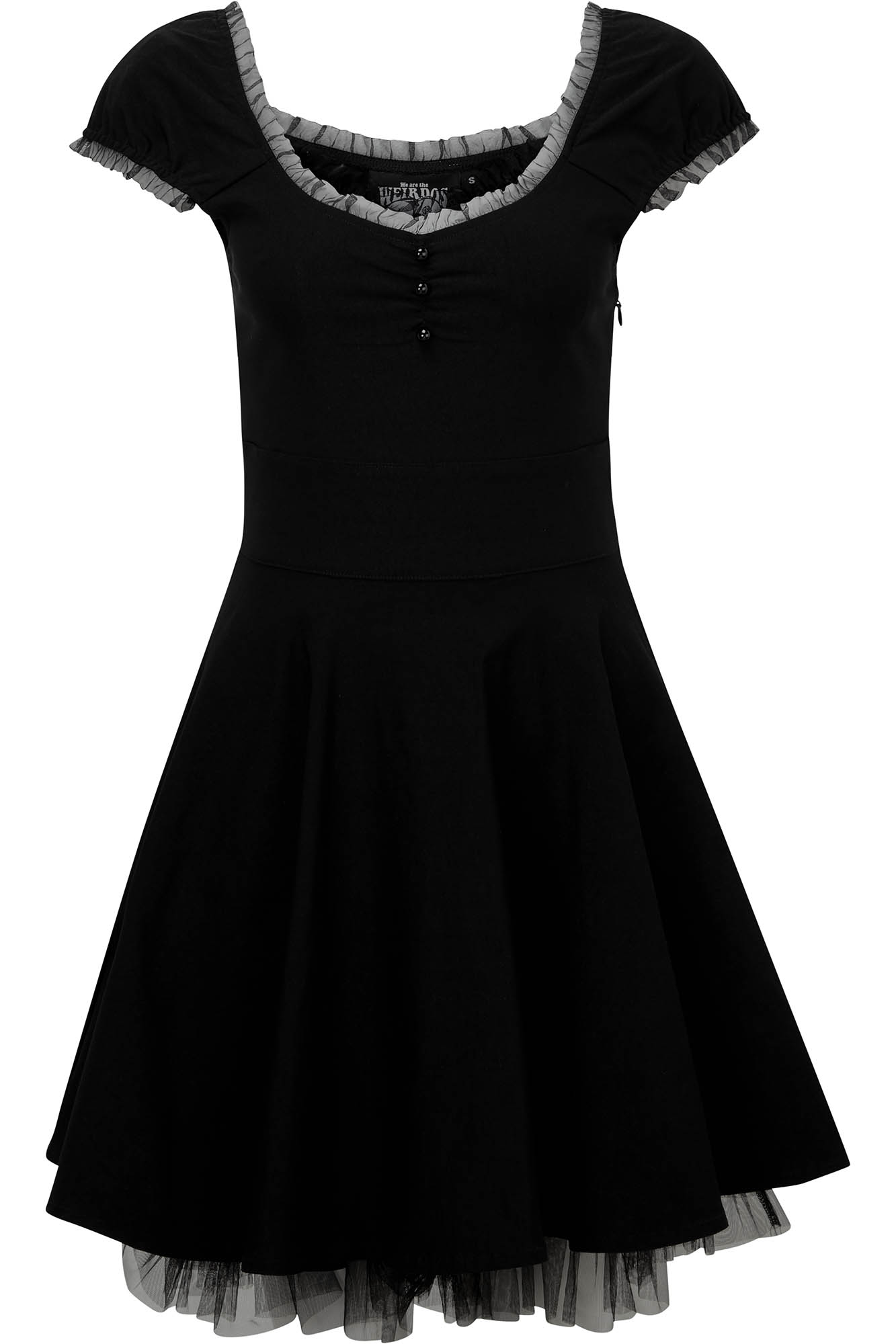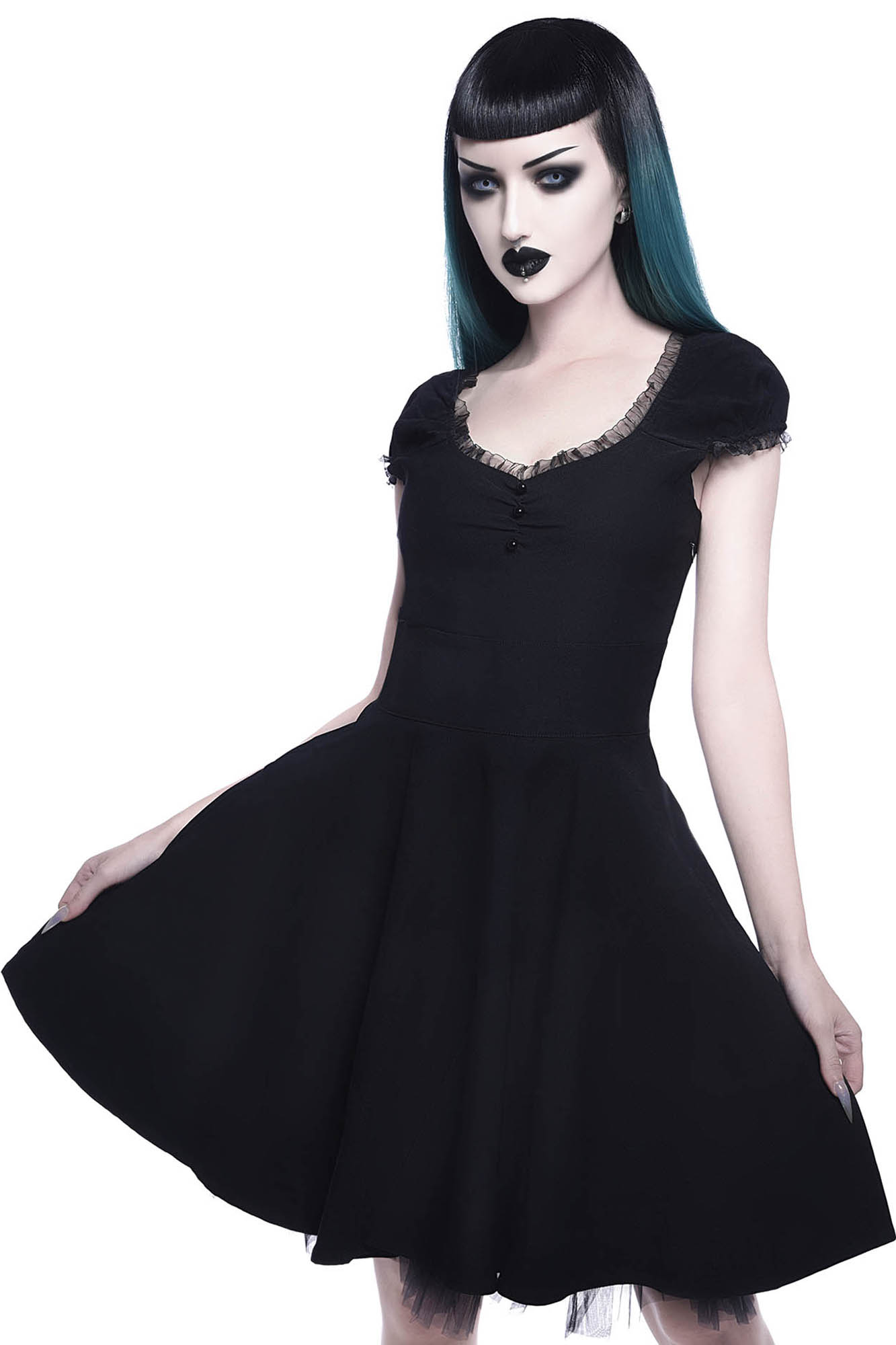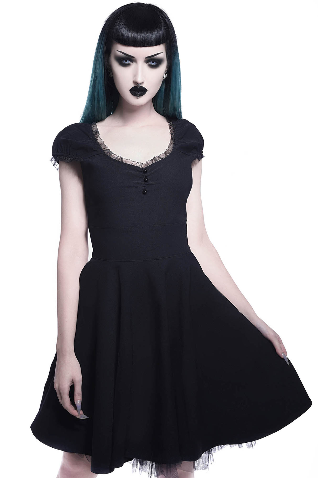 Put the fun in fun-eral with the 'Aisling' party dress. Channeling a vintage vibe with its figure-hugging fit, constructed of woven stretch fabric for ultimate feel + comfort. With a low neckline, delicate lace trims, decorative buttons and generously flared skirt with tulle. Fits like a glove - purrfect for date night, parties or just yer daily/nightly adventures.