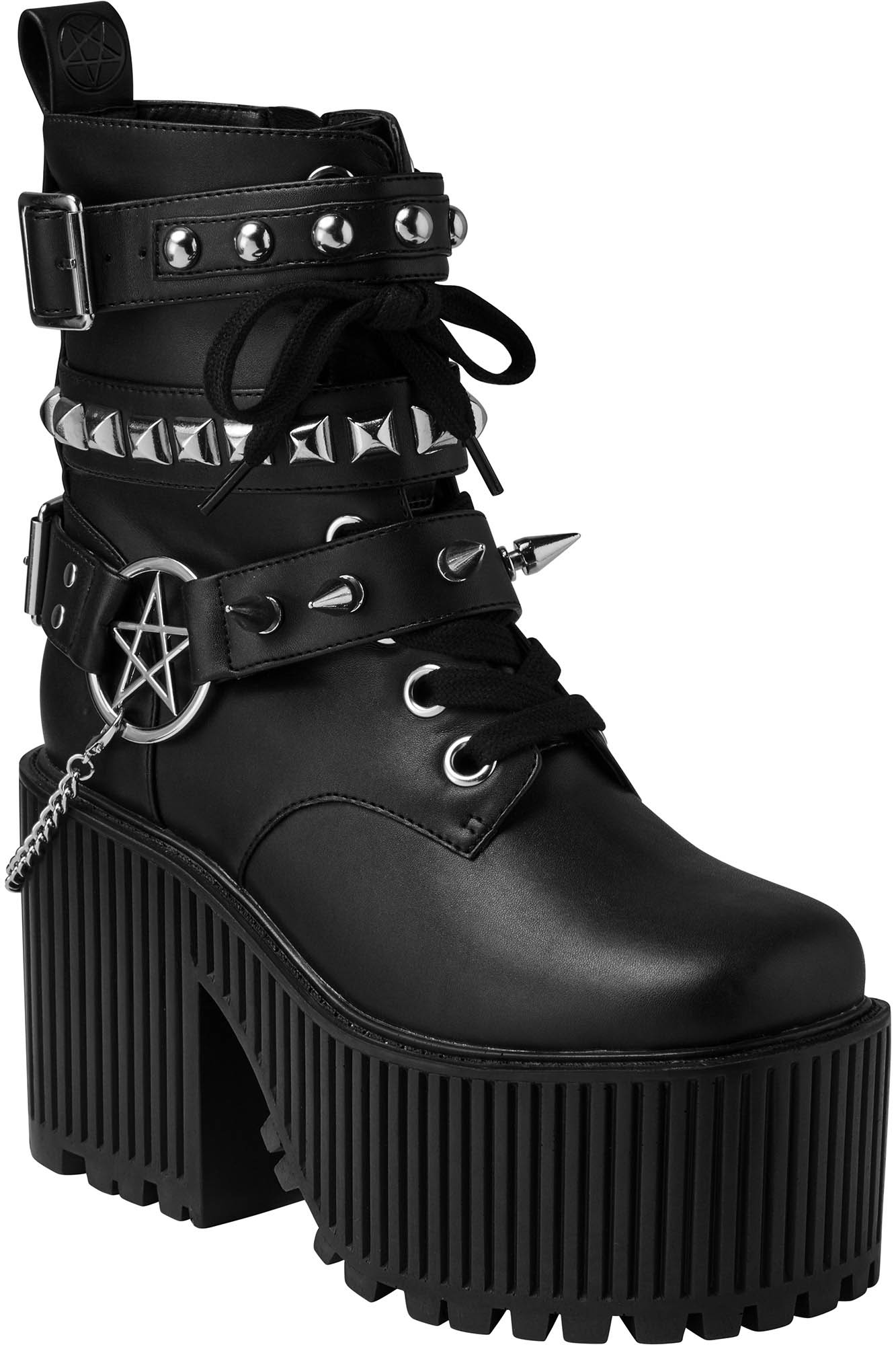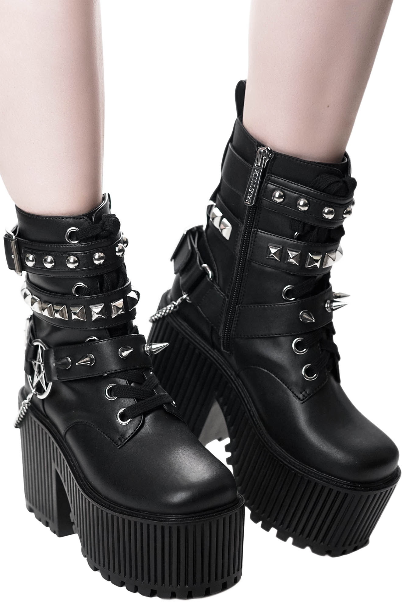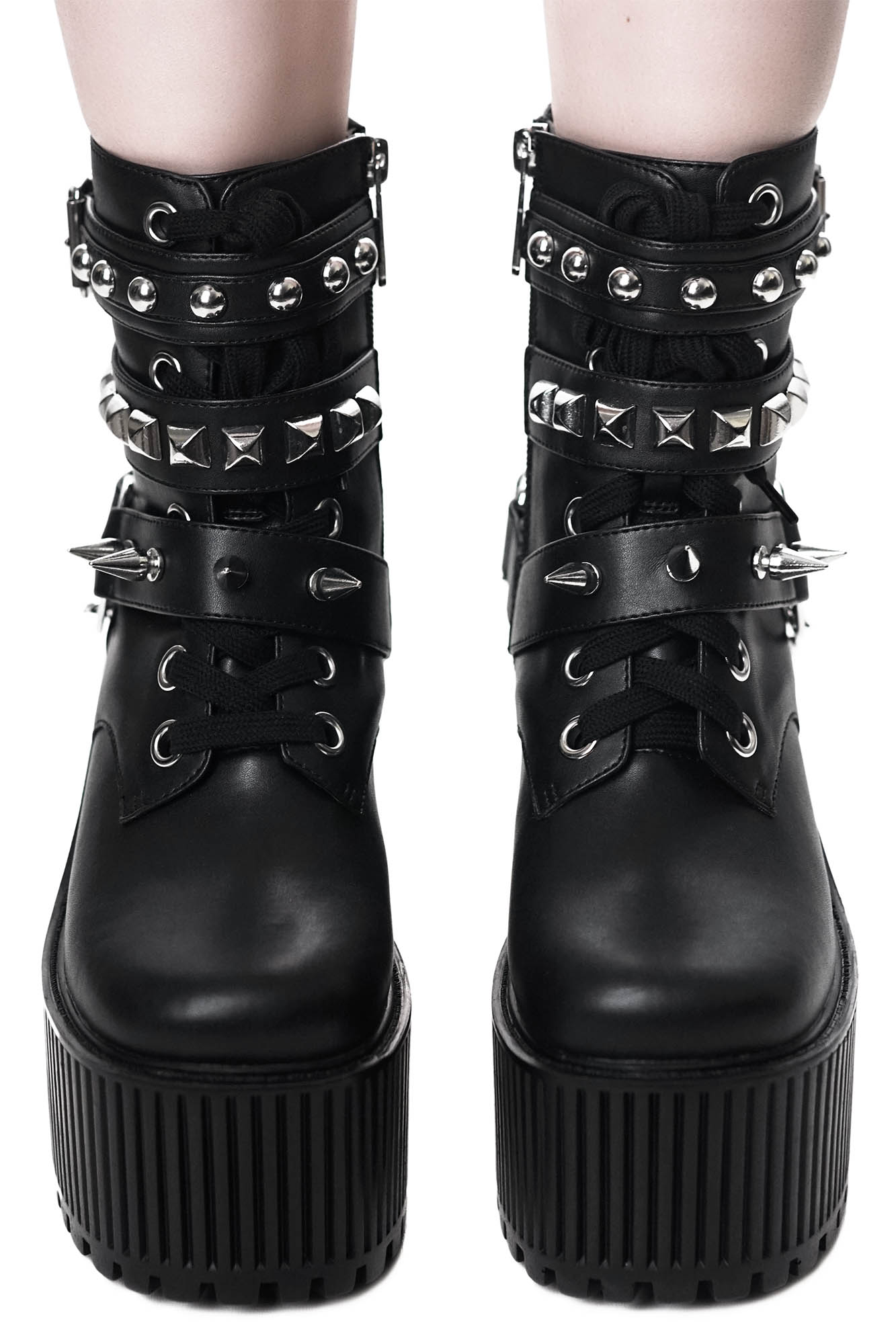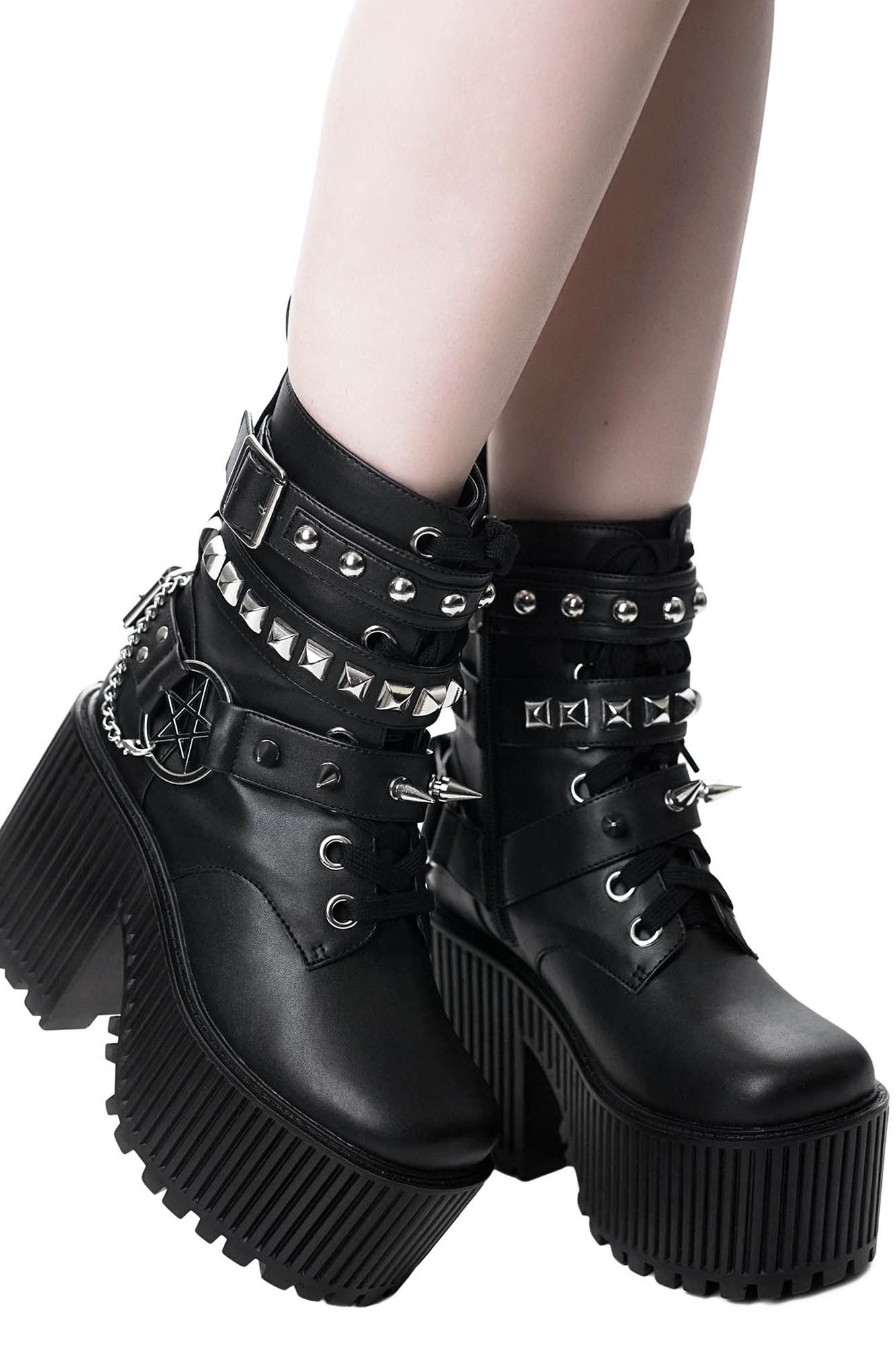 Mixin' sugar and spice; 'Alice' platforms boots are made in a high-grade faux-leather loaded with detail. Featuring statement straps with a mix of dome, pyramid and spike studs, pentagram hardware and detachable chain. Lace front and zip to the side for easy on/off. With a 4"/10cm high platform - giving you just the right amount of elevation. Ready to rock with yer coven, nights out - or just doing day-to-day adventures.
