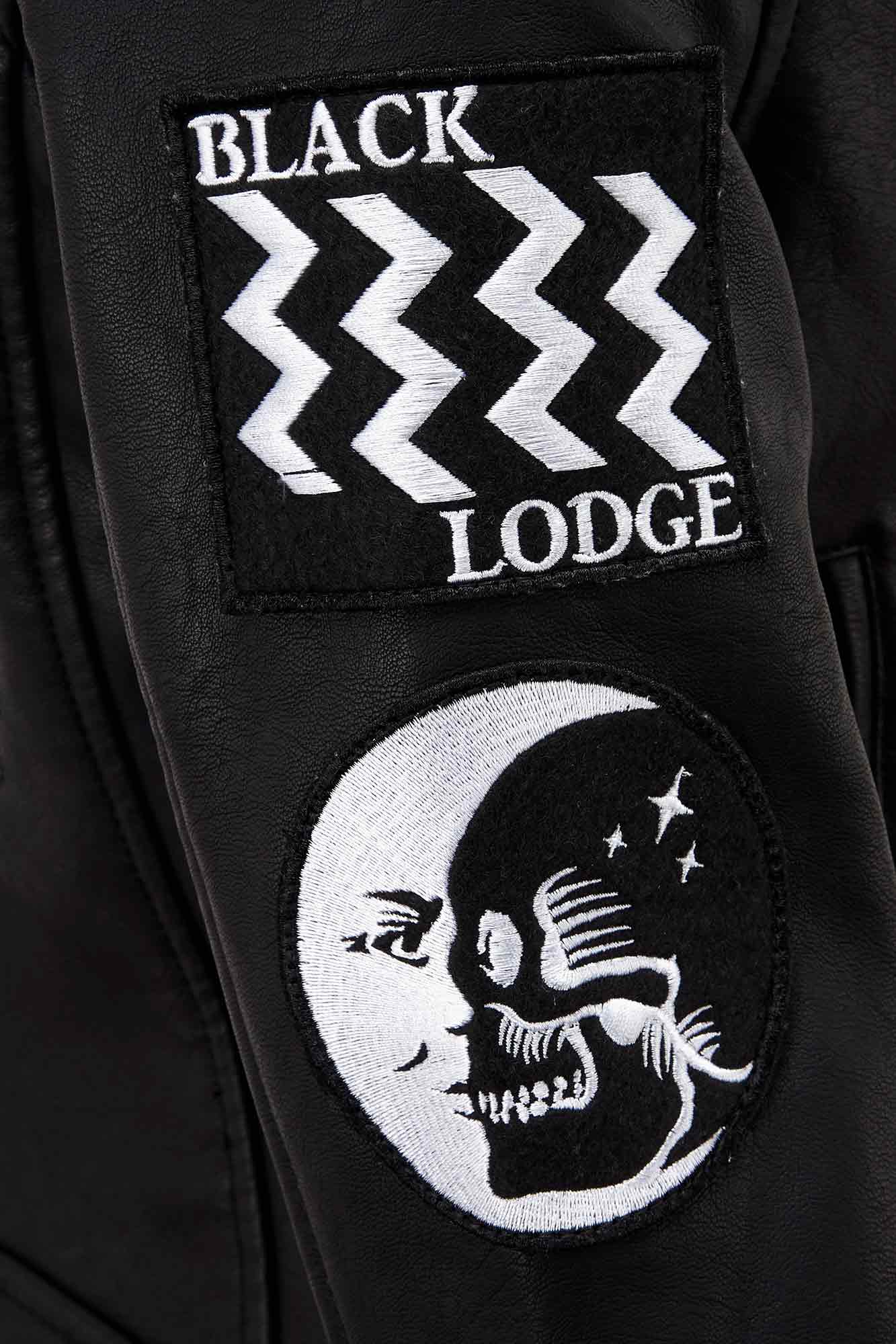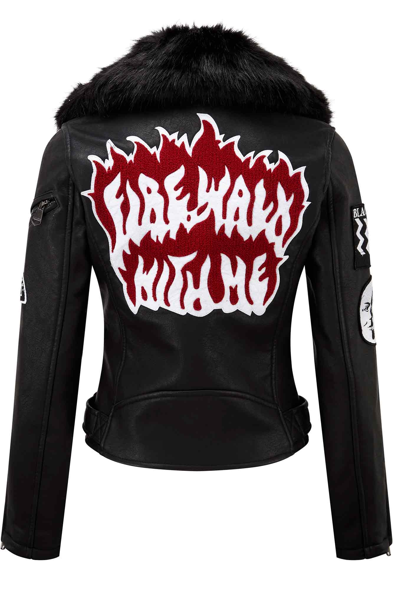Satisfy yer strange mind with a new classic leather biker for the cool dayz comin'.  Overloaded with rad detailing; zipped front + pockets/sleeves, faux fur collar, accent pins, large super soft chenille back-patch, statement sleeve patches and complete with a chevron satin-lining. And of course - all in a hyper realistic and textured vegan leather.