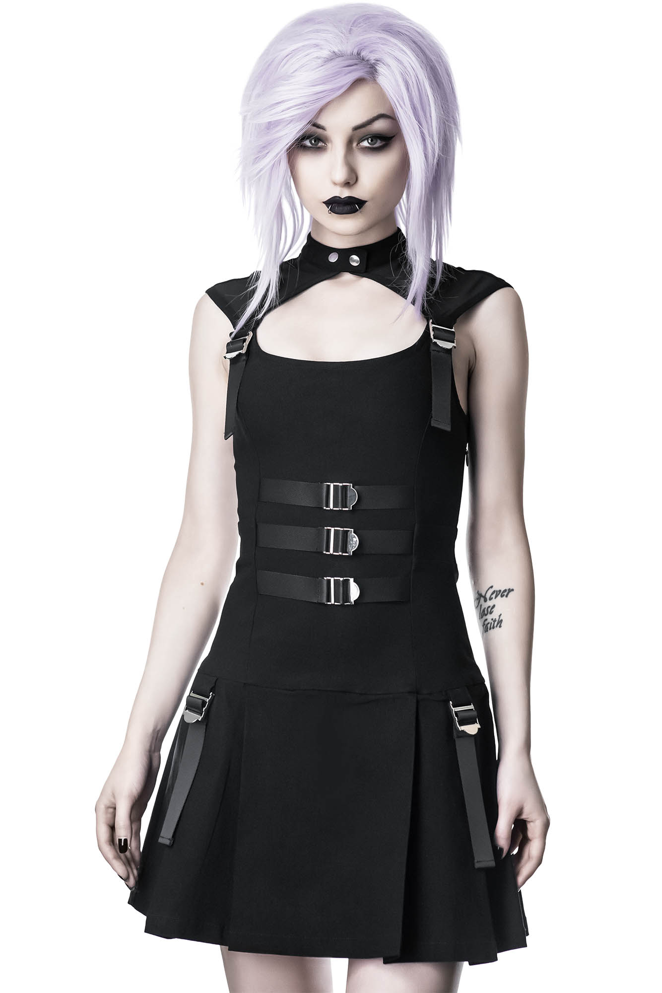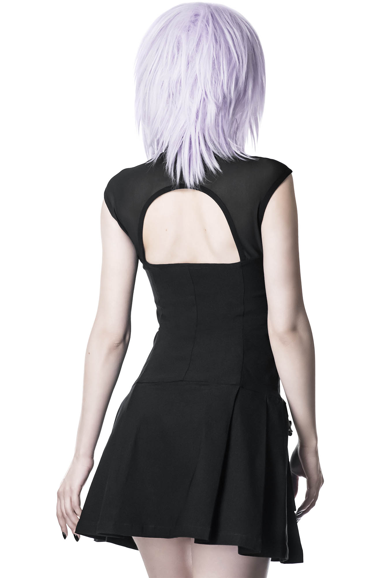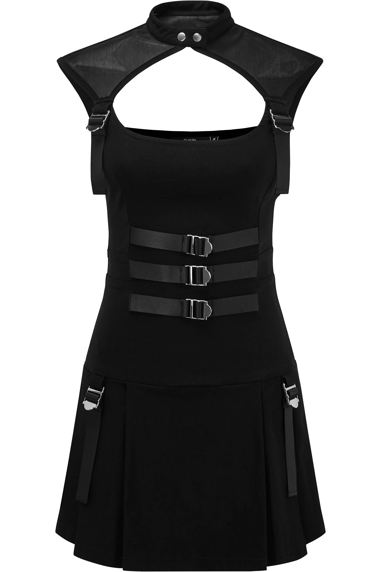 Stepping into the future, one step at a time. The 'Amplified' skater dress will tick all yer boxes; constructed of super stretch woven-fabric for a flattering fit - with a power-mesh yoke, high neckline with button closure, and short sleeves. A statement keyhole to the chest, cutout back panel, buckles & straps feature - as well as a generously, flared skirt. Easy to dress up or down depending on your mood/moon.