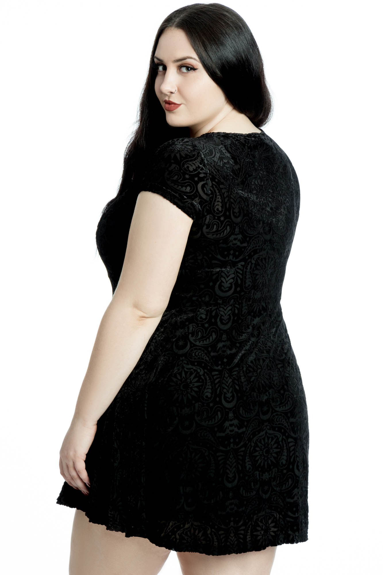 Forge your spiritual bond with the butterflies of the night; the moth will evoke the mysteries of the occult in you. The dreamlike 'Angelyn' skater dress is conjured of the softest lush velvet; with an intricate burnout paisley pattern and moths. Round neckline with corset-lace detail to front, cap sleeves and a flowing skater skirt. You are ready to go from dusk to dawn with ease in this flattering and versatile dress!