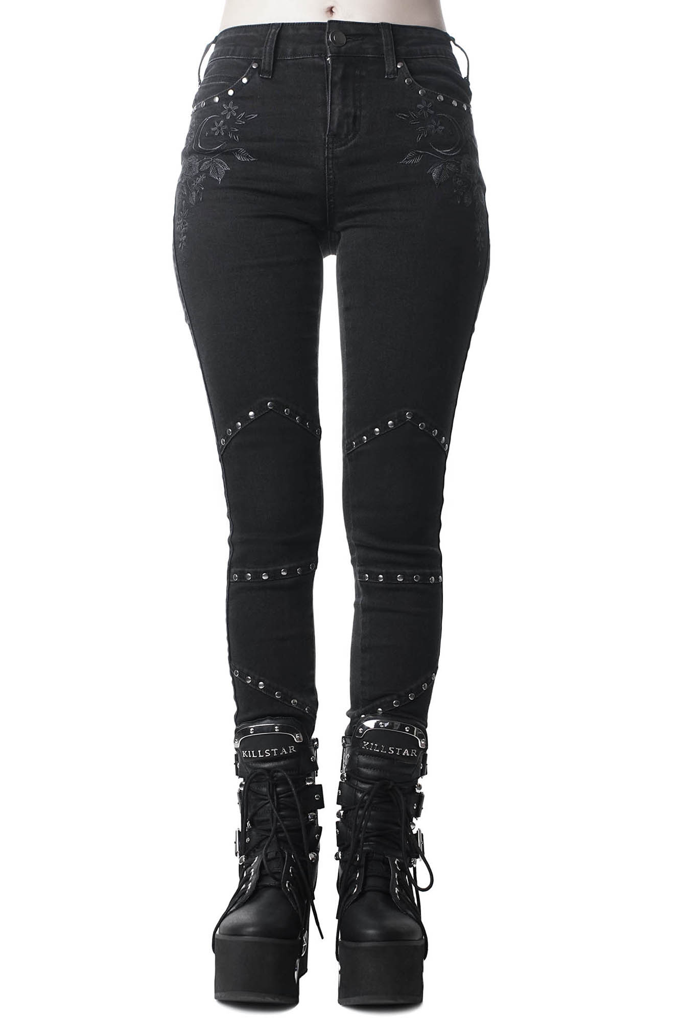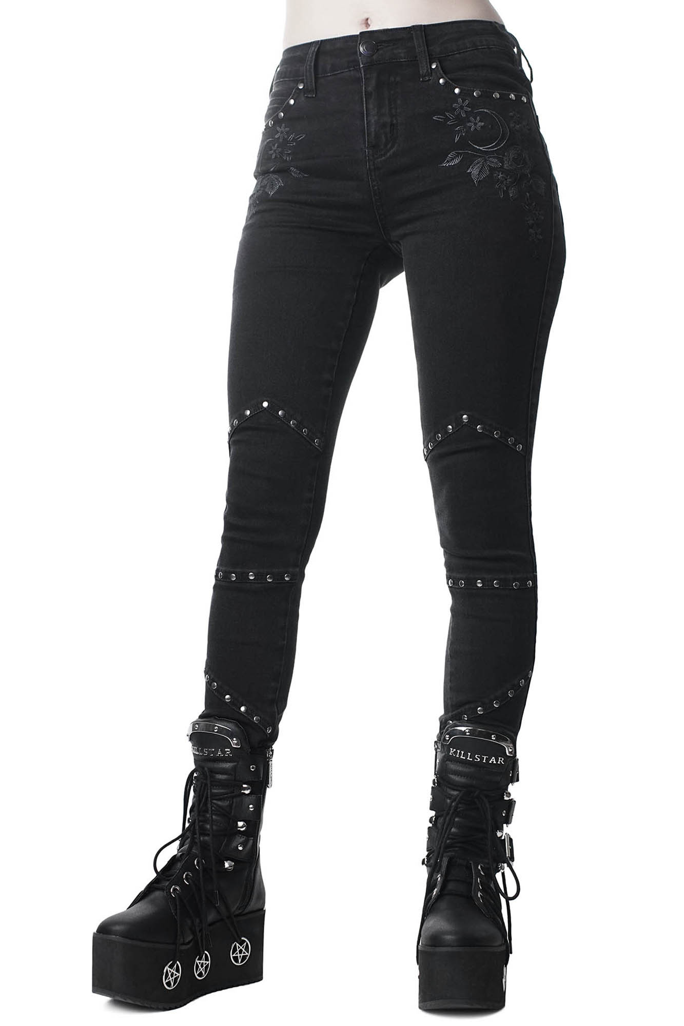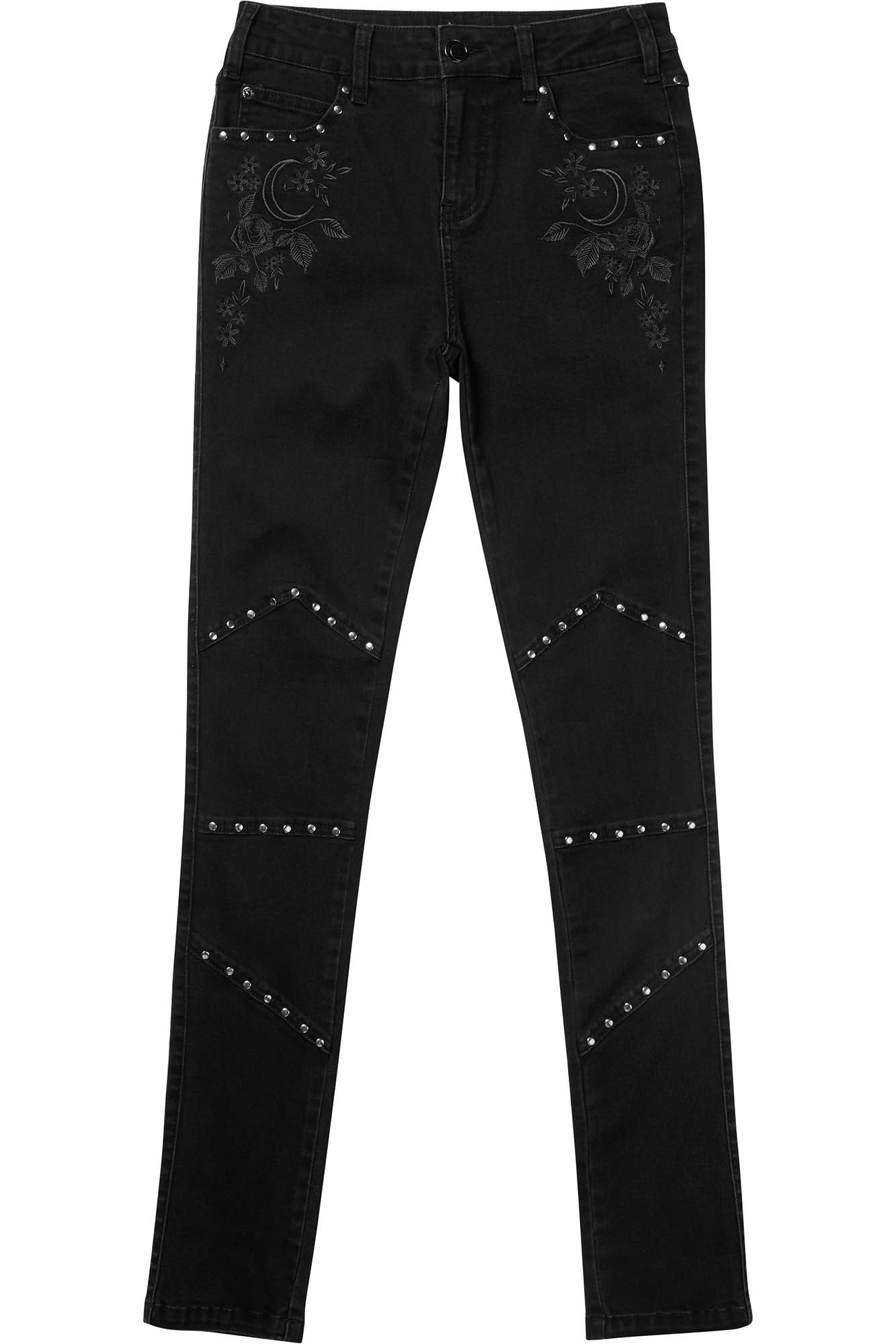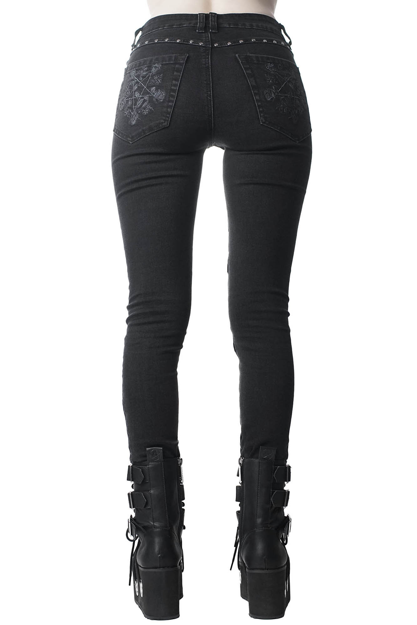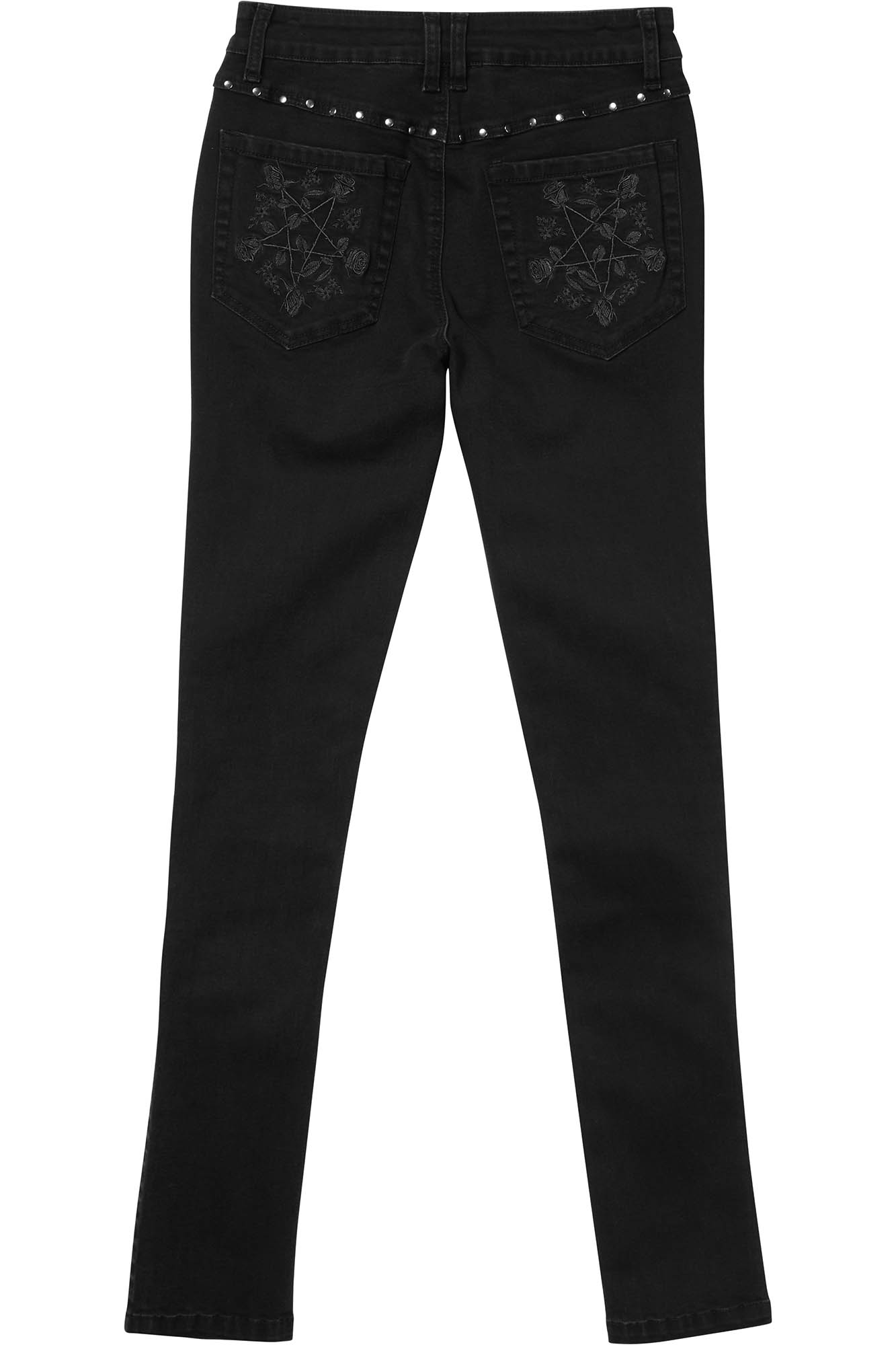 Enchanted by the wild and unknown, dwelling deep inside of your heart. Are you ready to fall in love with the 'Anika' statement jeans; in super soft stretch denim? A perfect blend of cotton and stretch for ultimate comfort and fit, loaded with details on both the front and back. Pocket-styling with zip front, belt loops, and stud closure. Adorned with a delicate and dark embroidery of roses, pentagrams, and moons - completed with studded accents to the key silhouette lines. Blessed be!