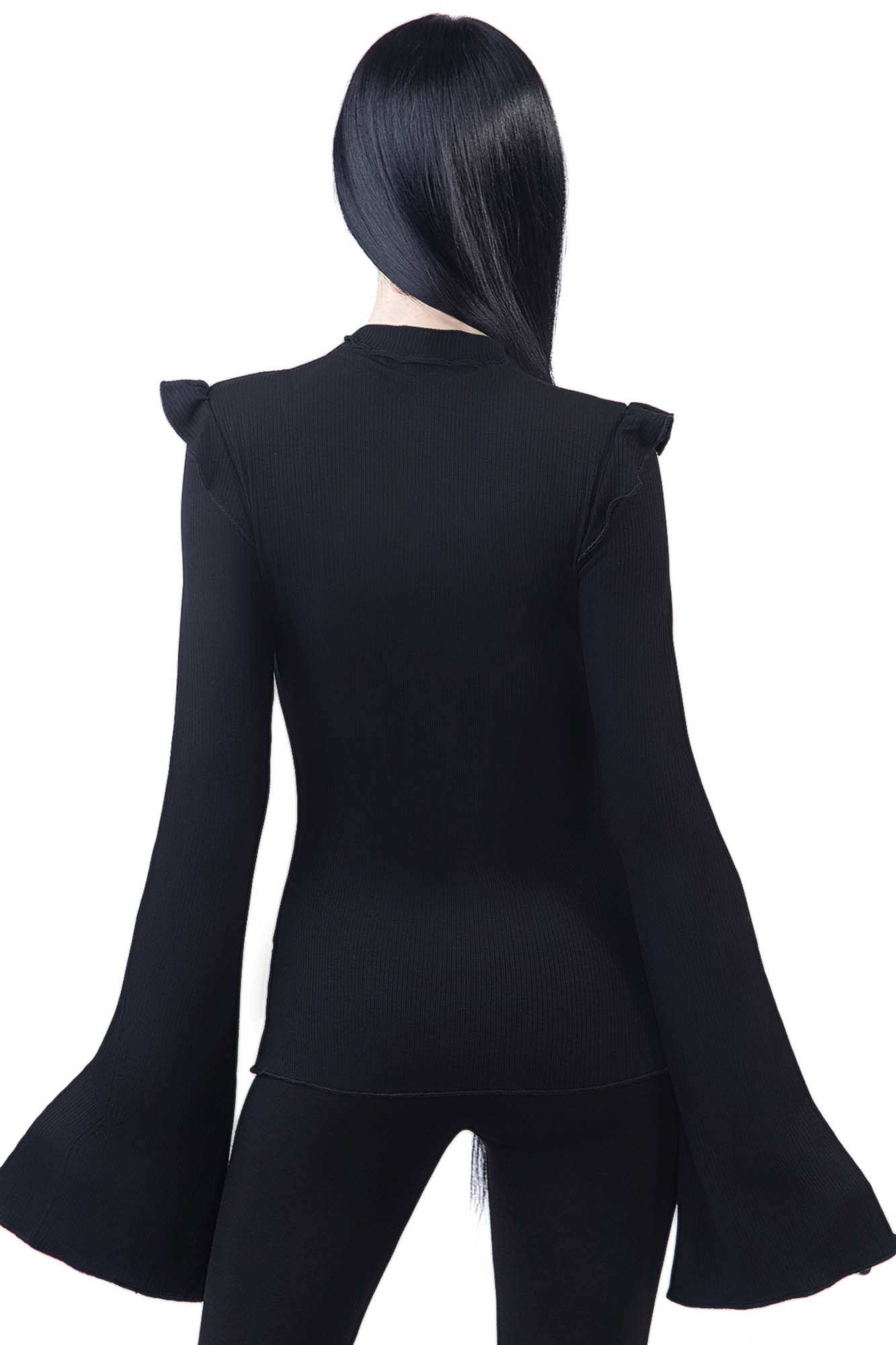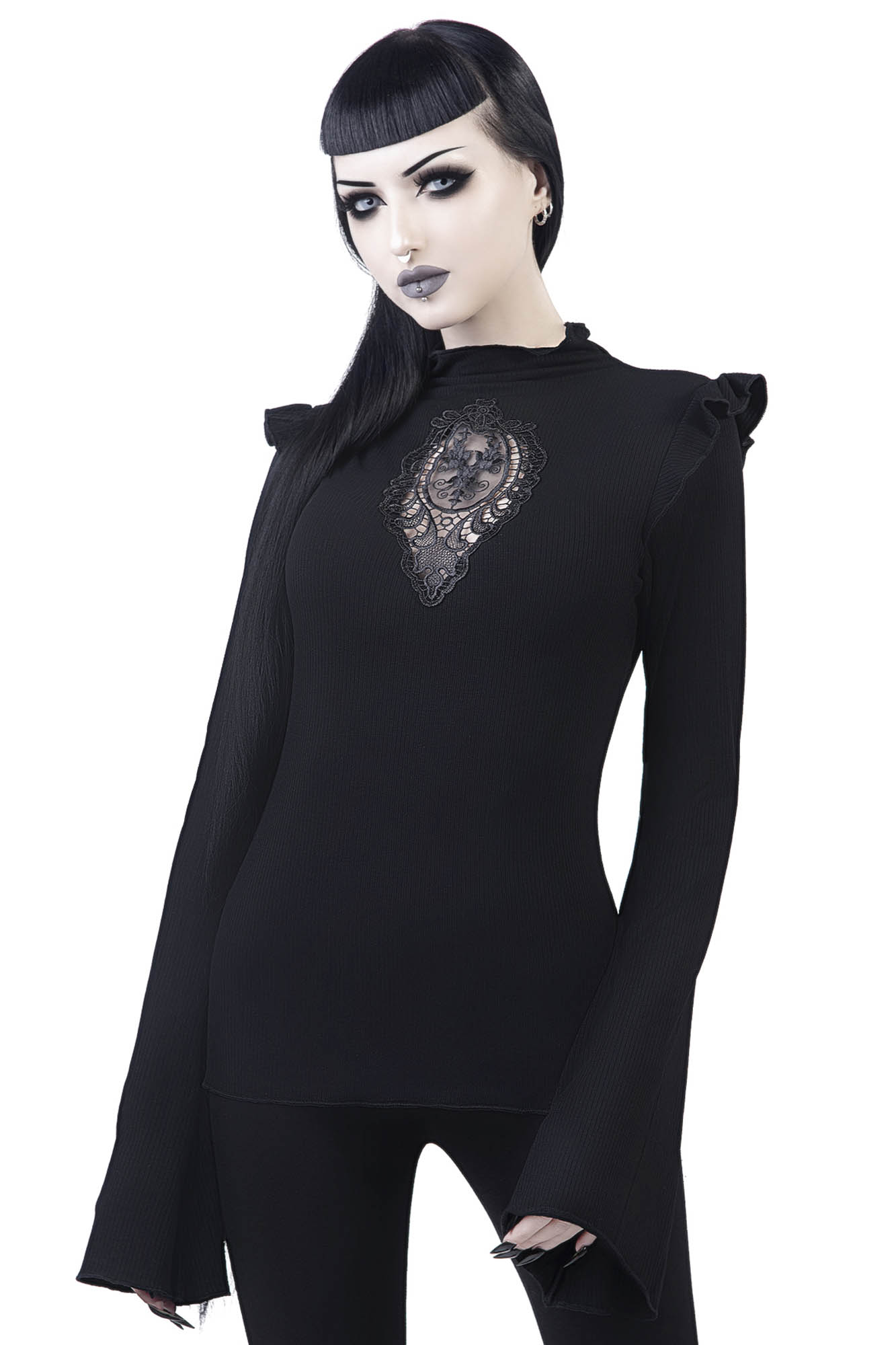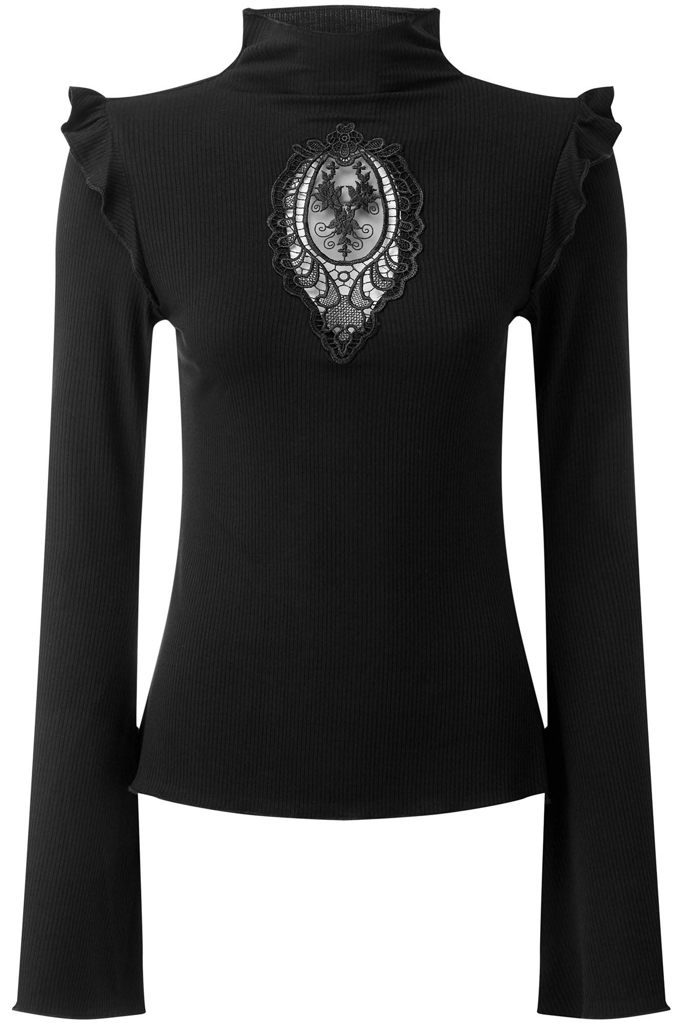 Be ready for any adventure in our 'Antonia' not-so-basic long sleeve top. Super soft ribbed-jersey with just the right amount of stretch, with high neck, cut-out with lace appliqué and ruffle accents. Extra long bell-sleeves. An essential piece - easy to wear and goes with anything!